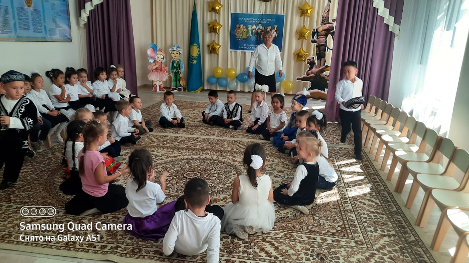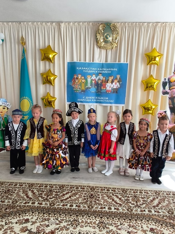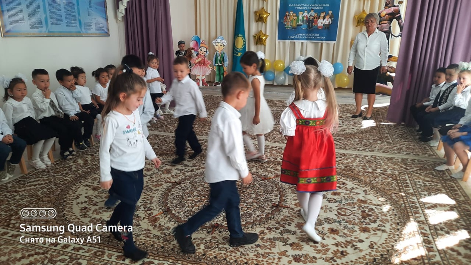 Цель: Познакомить детей с праздником - День языков народов Казахстана, с культурой разных народов: народными песнями, играми. Развивать умение двигаться под музыку. Обогащать музыкальные впечатления. Совершенствовать исполнительские навыки. Воспитывать интерес к культуре разных народов, уважение к людям разных национальностей.